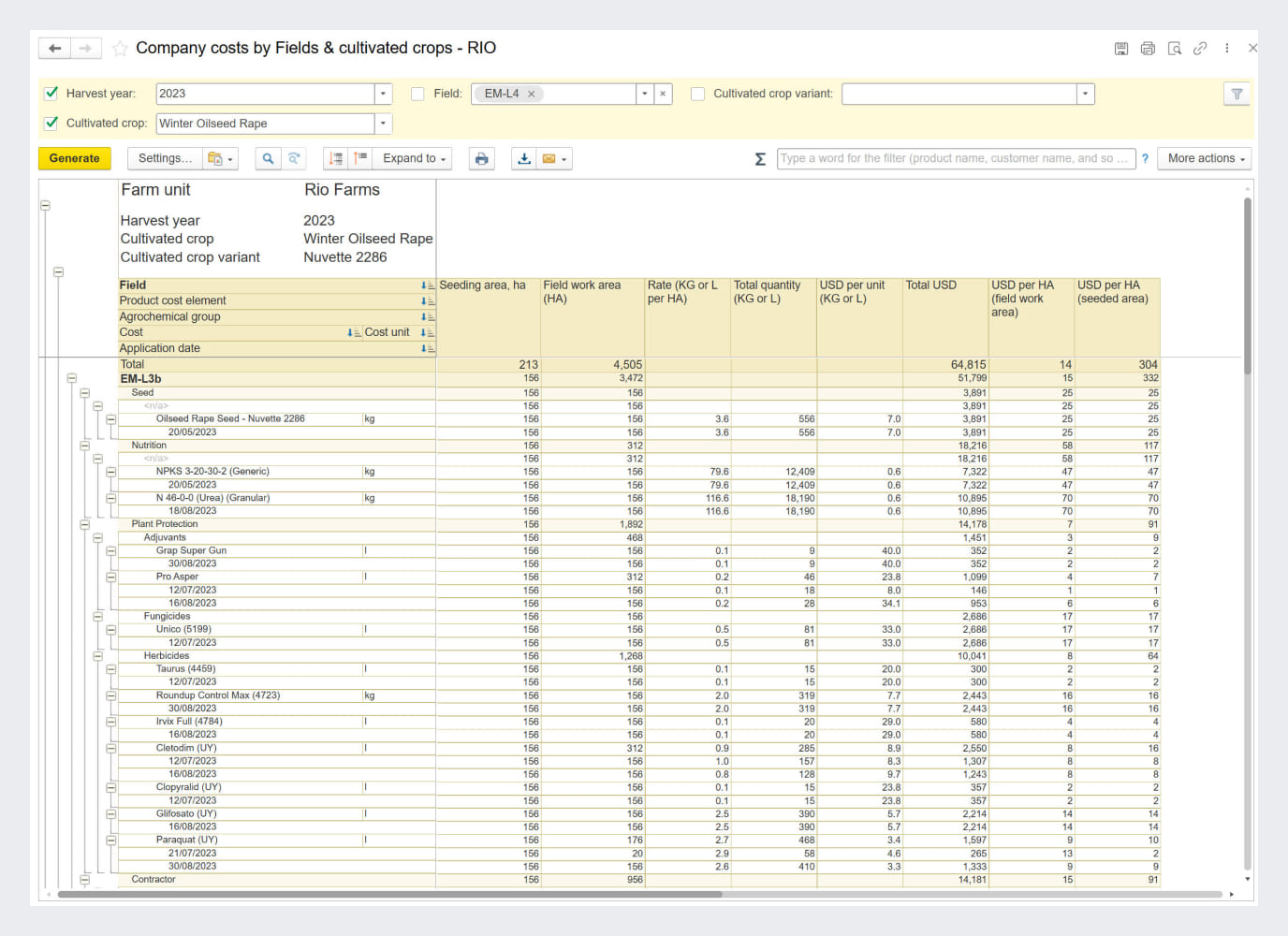 Wir haben uns speziell der Herausforderung gestellt, die Kosten auf Feldebene zu berechnen, eine kritische Buchhaltungsaufgabe für ERP-Systeme in der Landwirtschaft. Mit dieser Funktion können Benutzer detaillierte Finanzdaten bis hin zu einzelnen Feldern anzeigen und die Kosteneffizienz pro Flächeneinheit messen, egal ob es sich um einen Hektar, einen Acre oder einen Quadratmeter handelt. Durch die Einbettung dieser Funktion ermöglichen wir ein präzises Kostenmanagement und eine verbesserte Entscheidungsfindung auf Mikroebene.