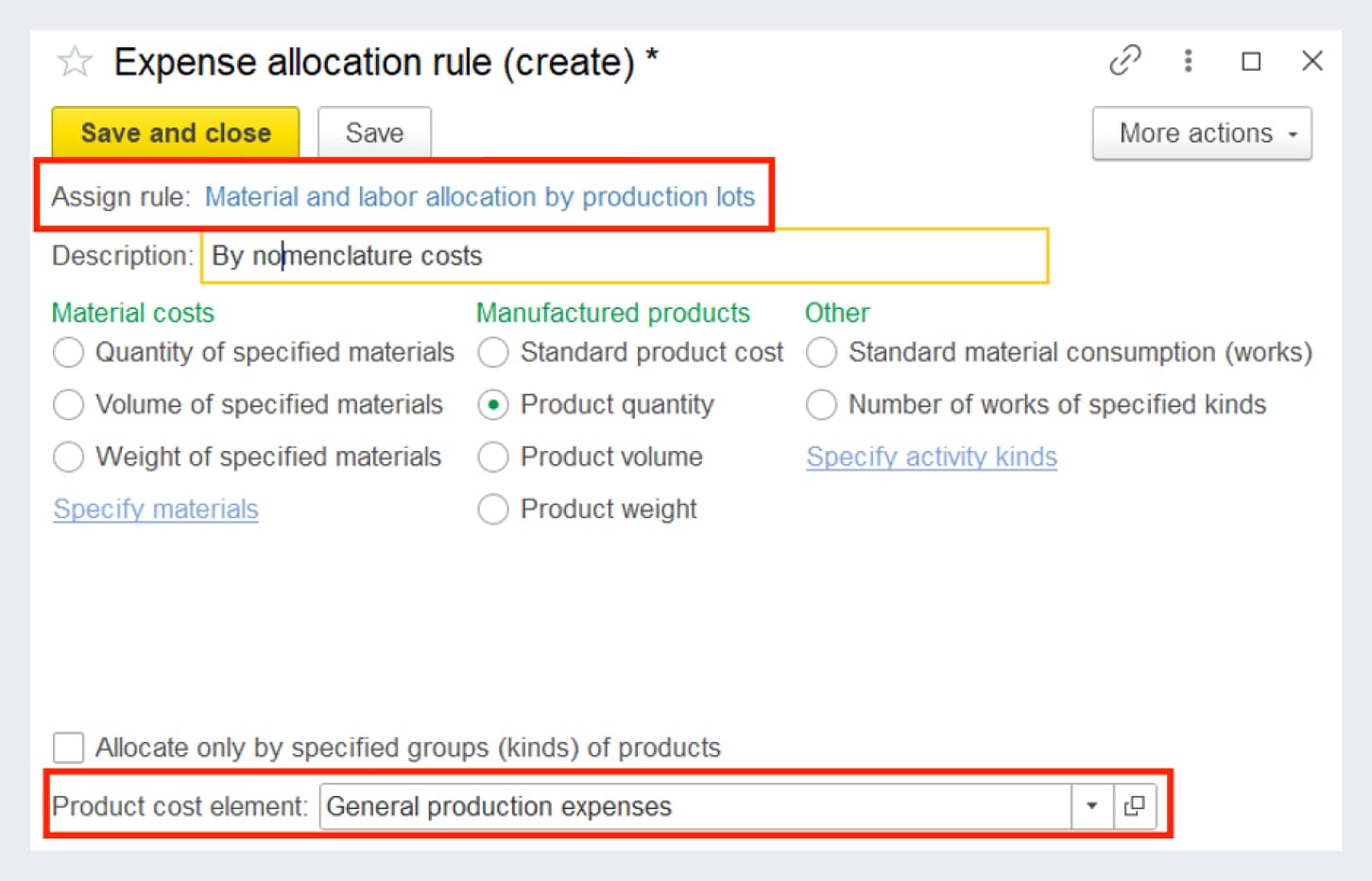 To allocate product costs, use the "Material and labor allocation" document, which allows you to check the allocation base generated according to the selected rule.