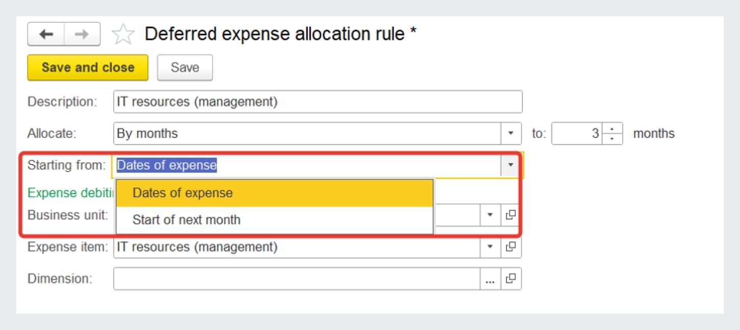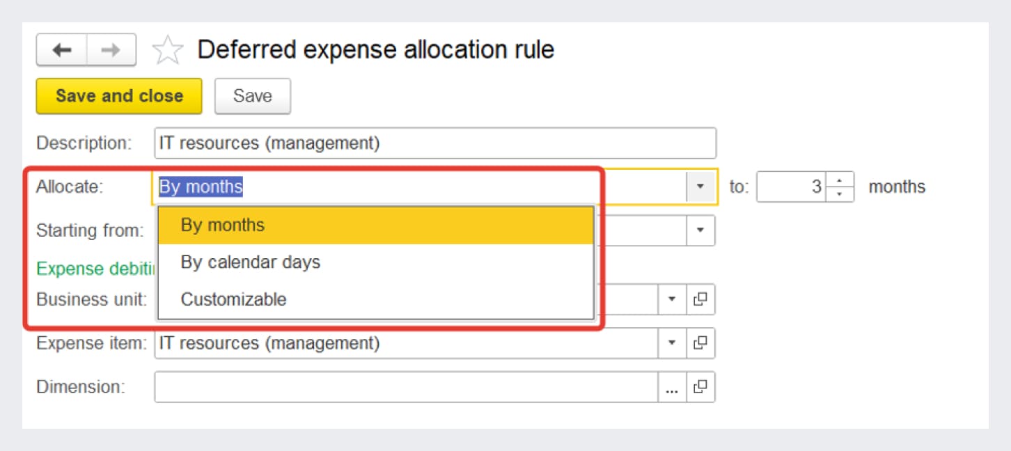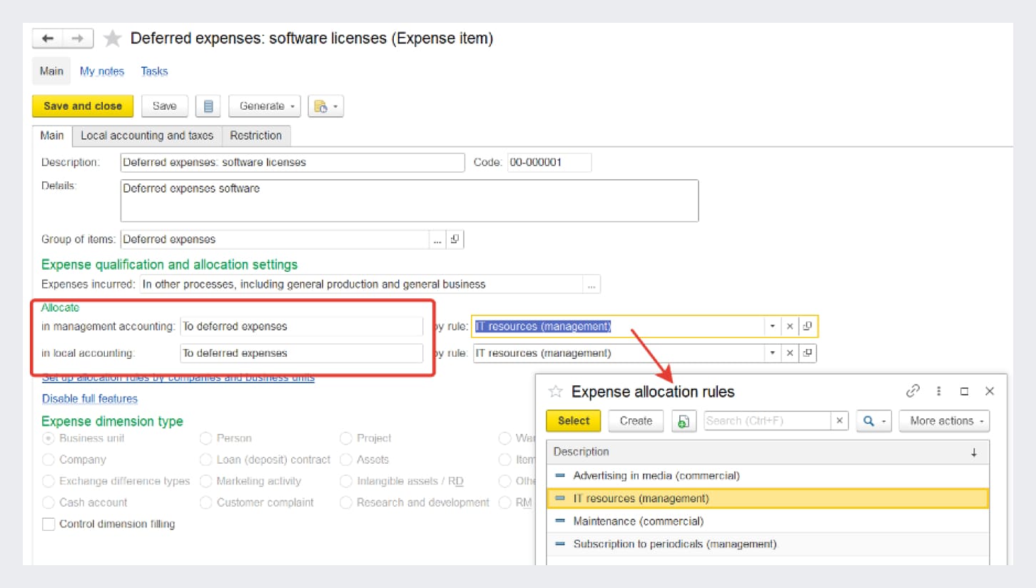 The "Deferred expense allocation" document is generated according to the rule selected for the expense item to allocate. You can specify allocation parameters of a specific expense directly in the "Deferred expense allocation" document.