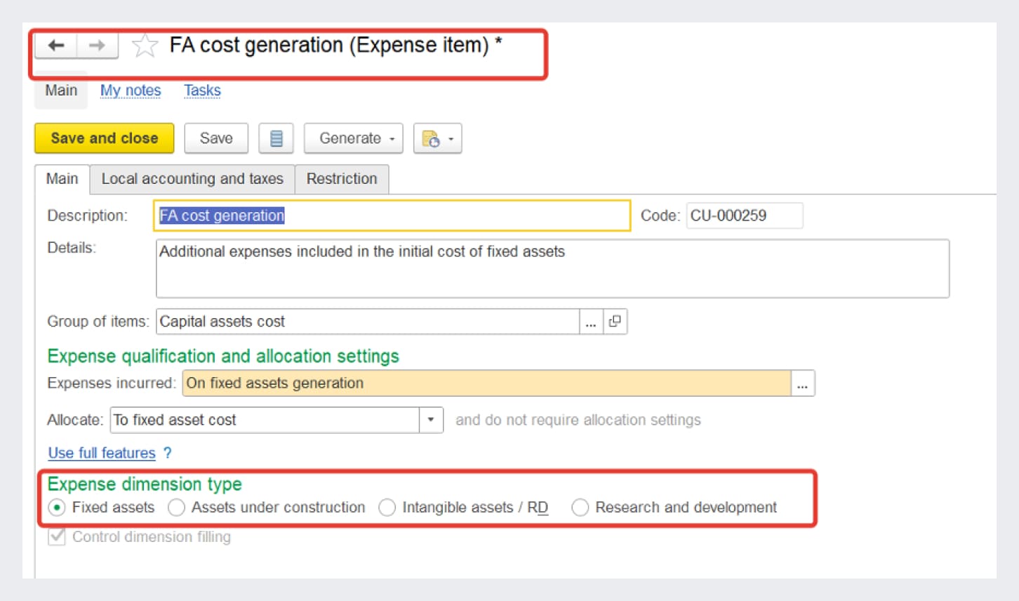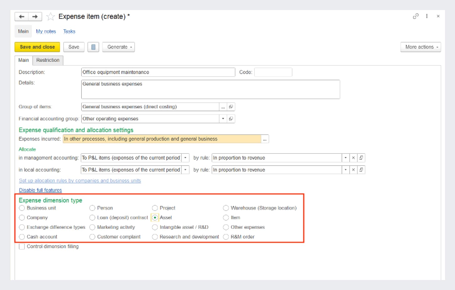 Parameters of expense write-off dimension indicating a business unit and expense item with the corresponding dimension value.