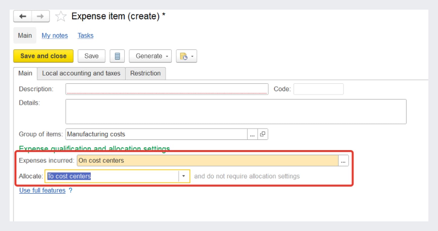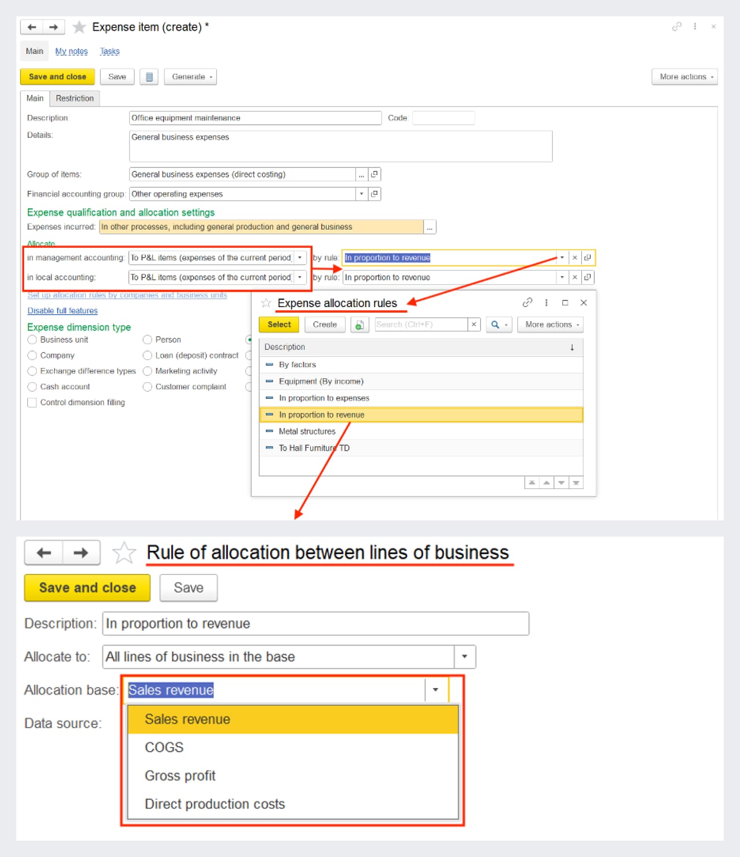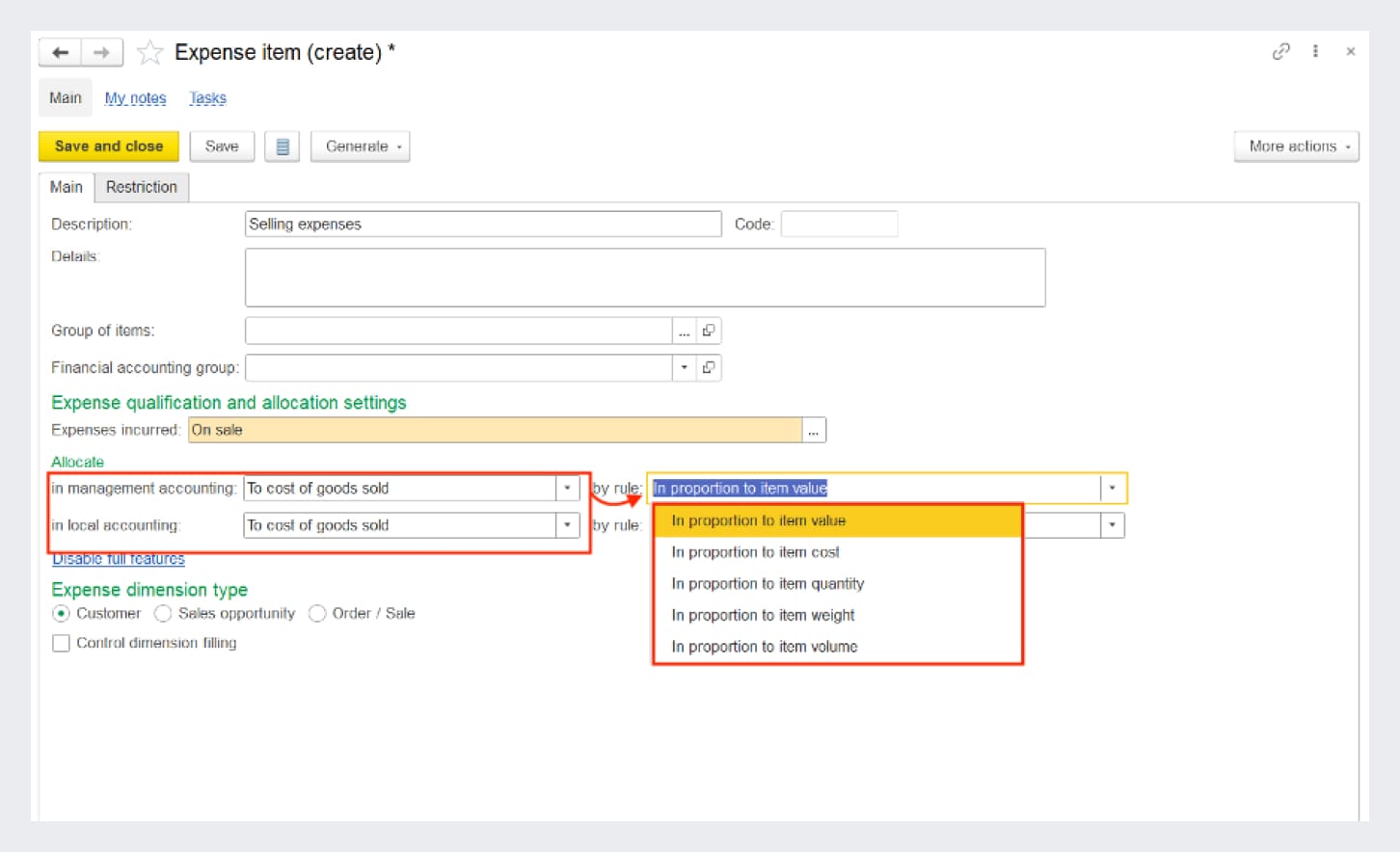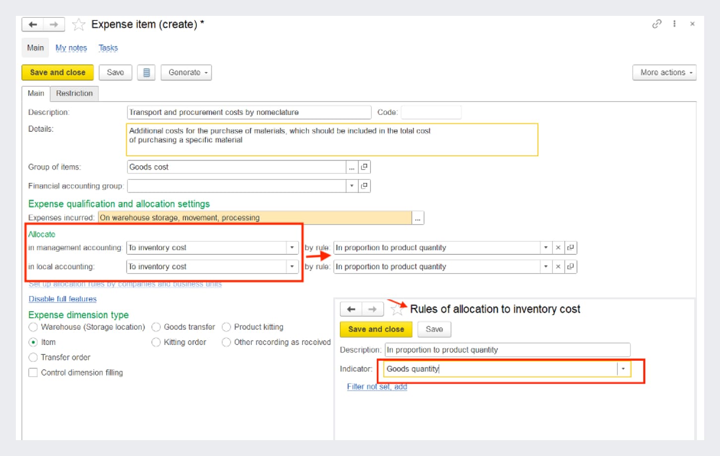 There are various options for allocating itemized expenses. They determine the economic sense of expenses recorded under a specific item: