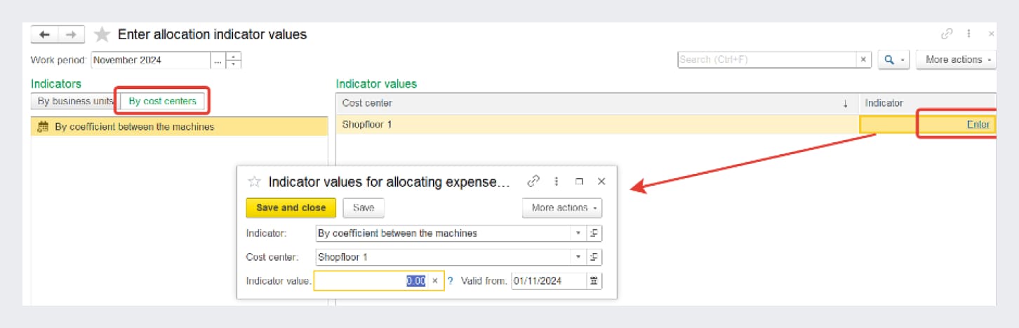 You can enter the values of expense allocation indicators by cost centers in the "Allocation rules and indicators" list item card (click "Edit values") and in the "Enter allocation indicator values"workplace.