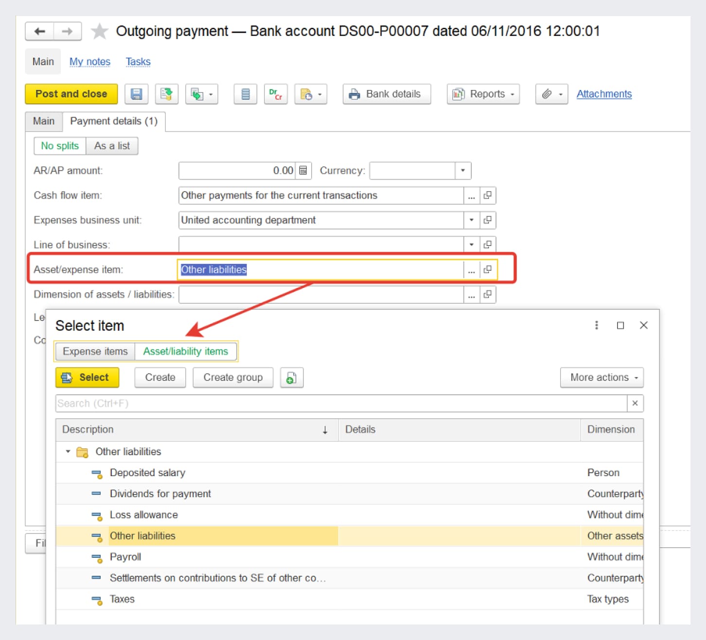 To register other transactions, use standard documents where the asset/liability items are specified.