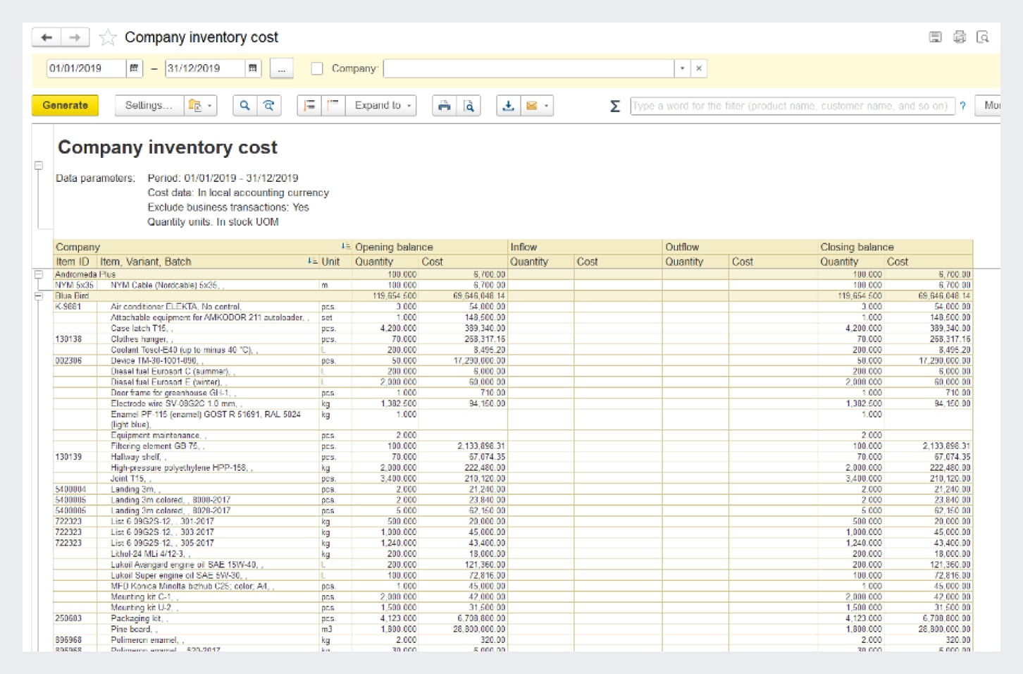 Amounts of inventory costs outside production processes can be generated broken down by various types of expense dimensions: