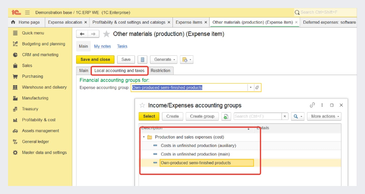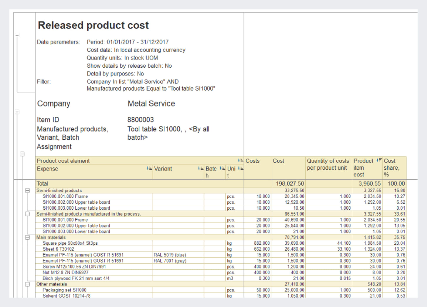 1C:ERP Enterprise Management allows you to record material, labor, and financial costs. Expense evaluation in monetary terms ensures a comparable record of resource consumption by lines of business.