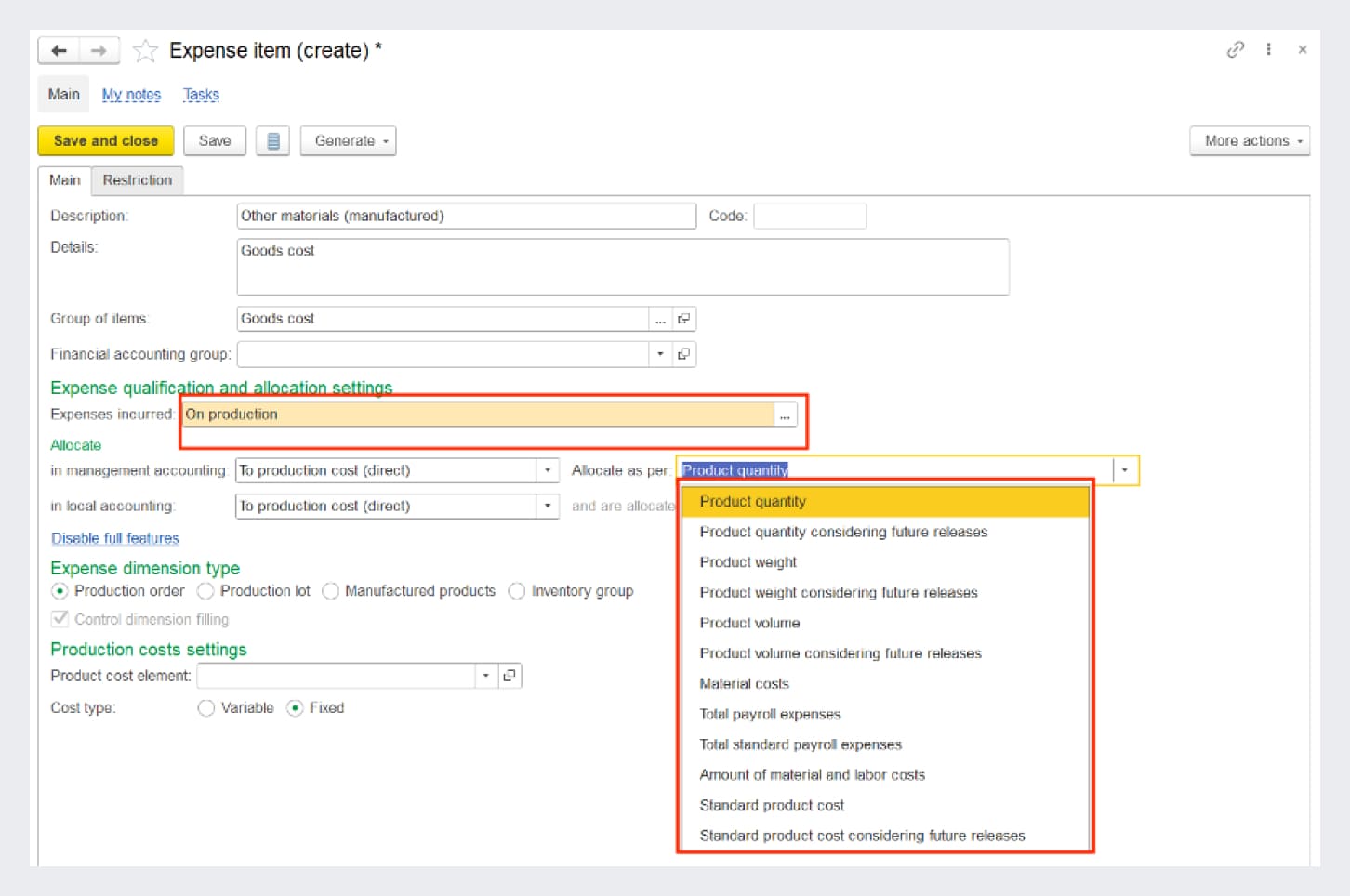 The allocation base for such expenses is specified in the "Expense items" list card. You can select the following bases for allocating itemized expenses to cost of goods sold: