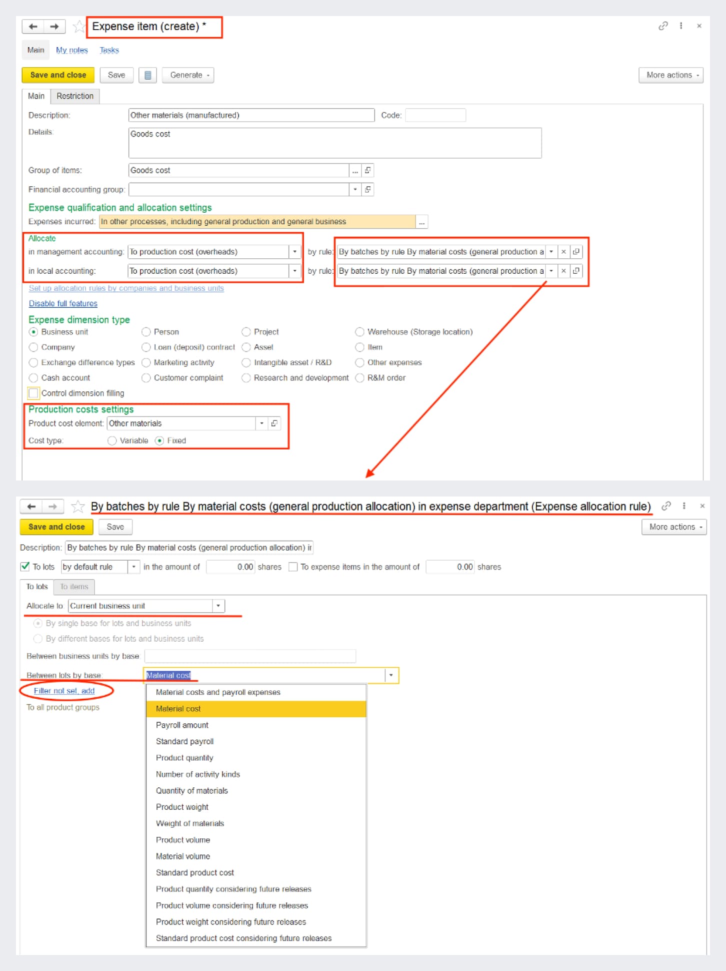 Costs are allocated according to a rule set up in advance and specified during allocation. You can create a complex allocation rule by simultaneously specifying allocation by lots and expense items and cost shares for each option.