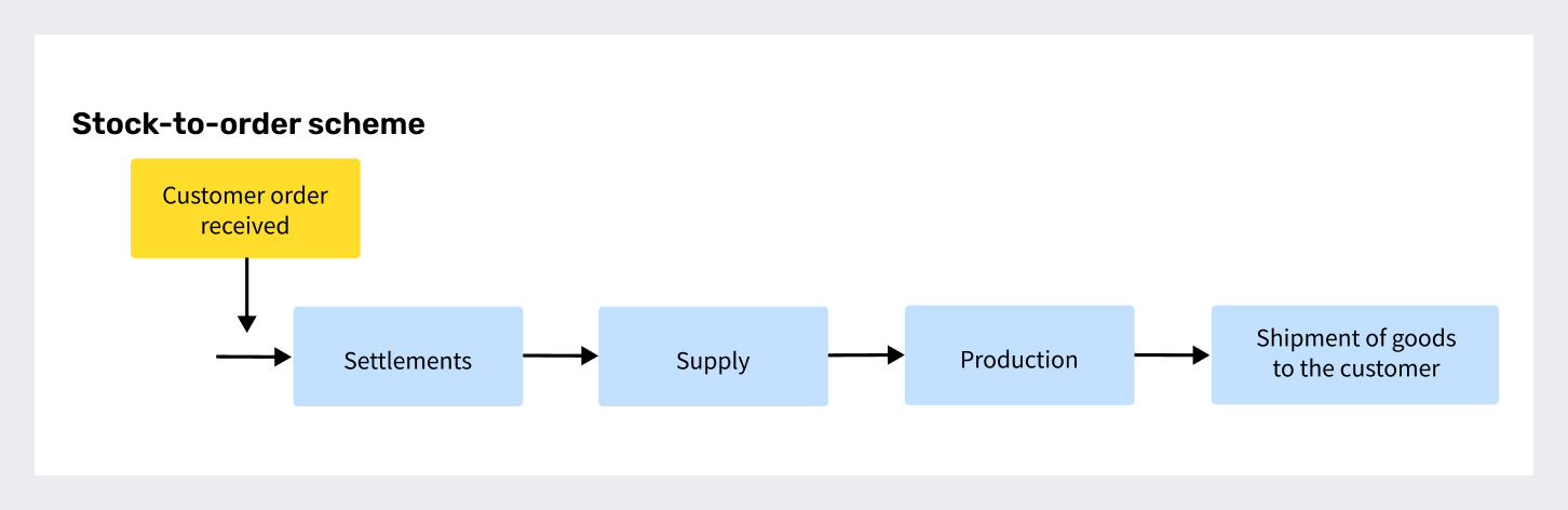 If you produce goods "for the warehouse", you need to forecast the demand in advance (before receiving orders from customers), supply materials for production, manufacture the required goods, and put them in the warehouse. Then customers come and order the products. If the necessary products are in stock, we ship them to the customers. Otherwise, we ship nothing.