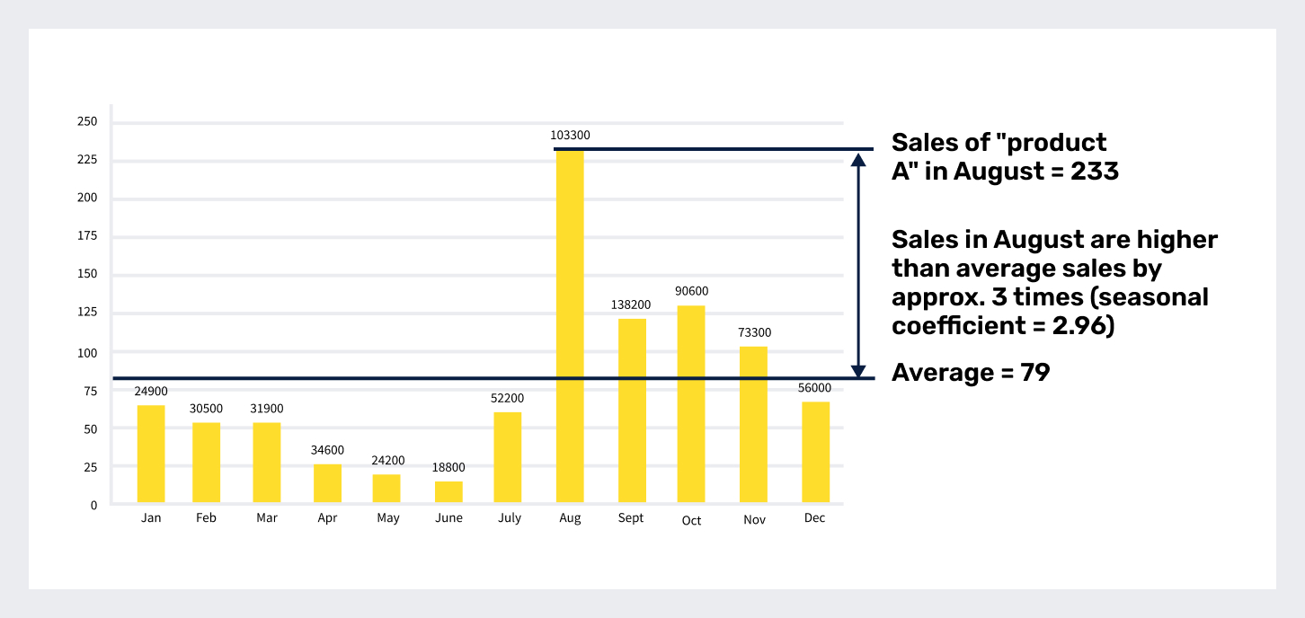 There are many approaches to calculating seasonal indexes (additive or multiplicative seasonality). Seasonal indexes in 1C:ERP are calculated as a deviation from the average sales for the period (multiplicative seasonal indexes, the middle line is taken as the base).