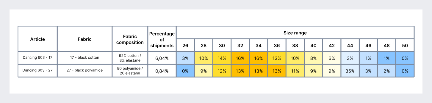 An important feature of sportswear sales is the dependence of demand on the model, color, fabric, and product size. As a rule, the dependence of demand on the size has a normal (Gaussian) distribution, and the distribution parameters will depend on the model and properties of the fabric. For example, pure cotton products are more often bought for young children. For some dark products, demand may be shifted towards larger sizes.