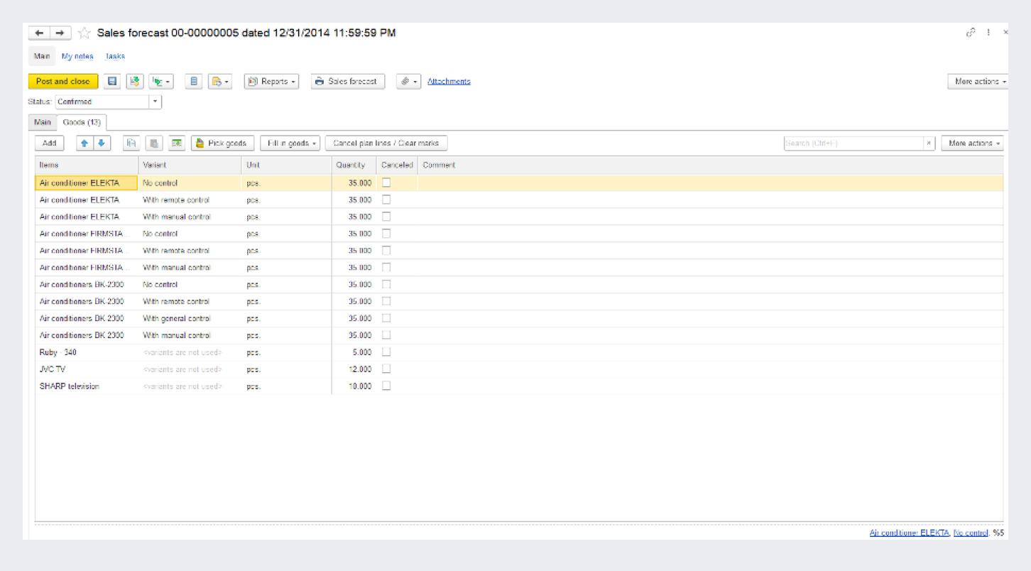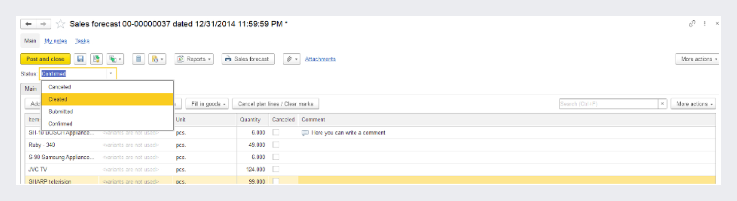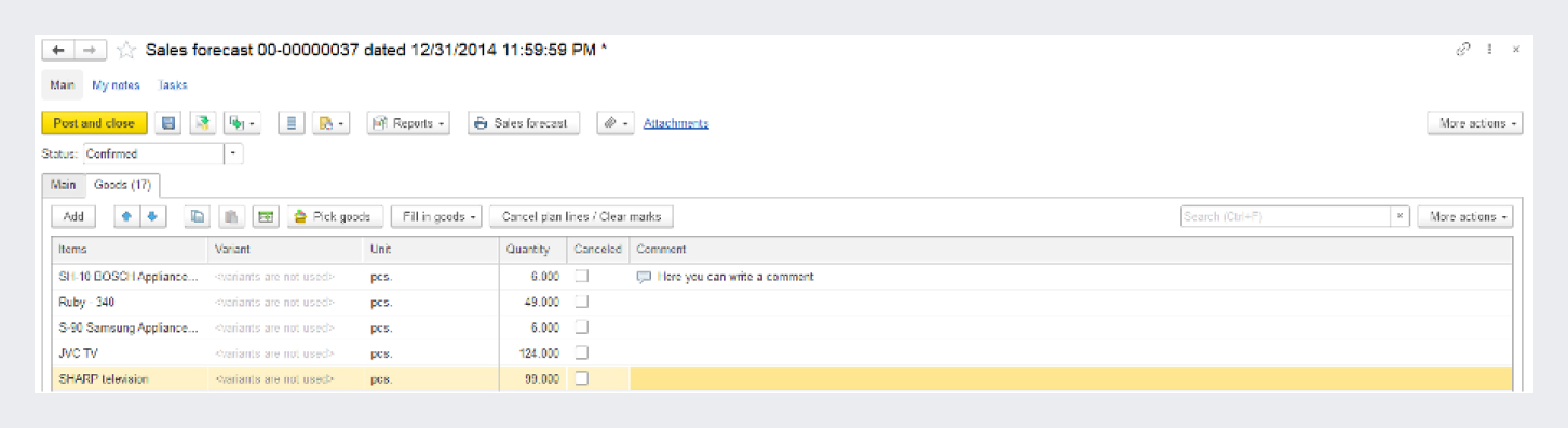 In 1C:ERP, you can enter comments on each row of the forecast table (on each item)