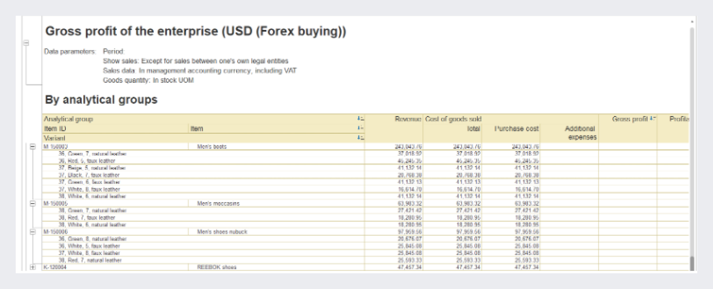For example, a sales report for a period can show sales data broken down by color, fabric, and product size. You can create a sales forecast broken down by the same dimensions and take into account different demand dependence on the color, fabric, and product size.
