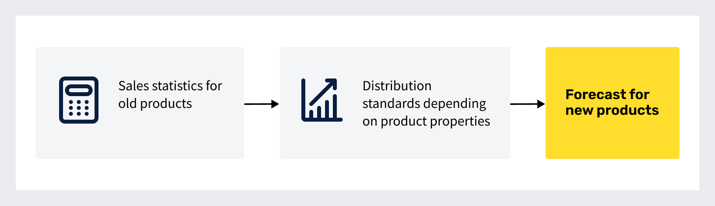 Demand distribution standards are calculated based on sales of previous periods. Standards are calculated broken down by goods parameters, and then these standards affect the sales forecast for new products.
