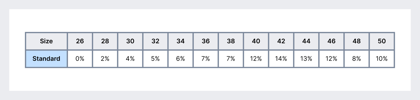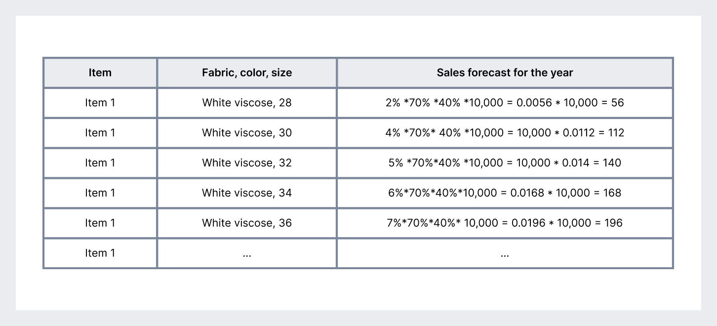 With three distribution standards, you can decompose the total amount of sales by category, multiplying the standards. For example, we plan to sell 10,000 / 5 * 0.6 * 0.3 * 0.1 = 36 pieces of "Item 1" made of black cotton, size 40.