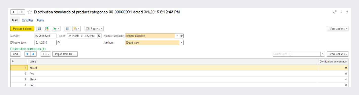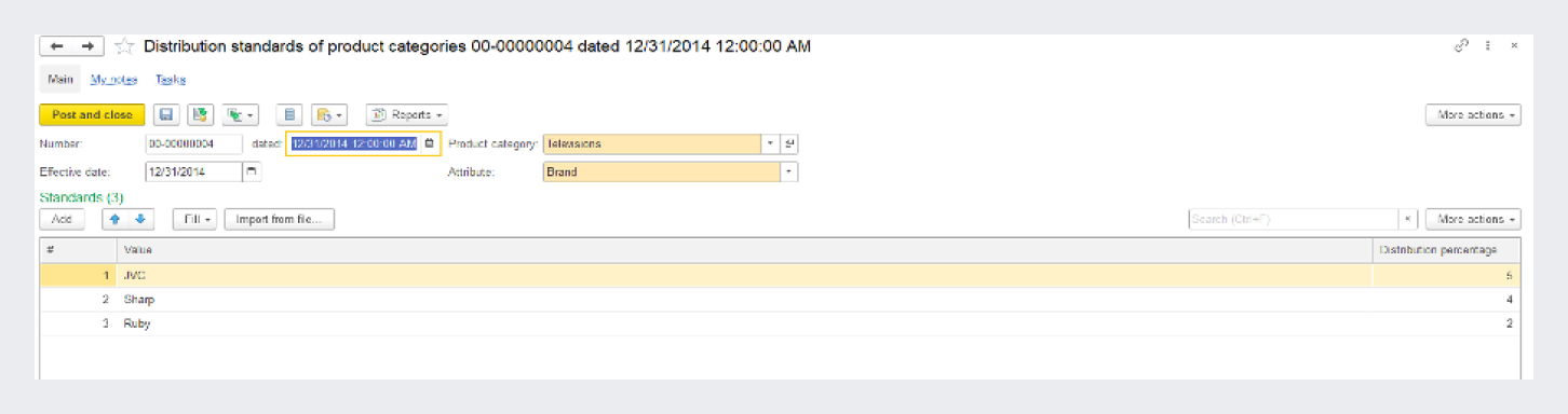 Distribution standard in 1C:ERP is a rule/share/percentage according to which the total sales figures by category are broken down to specific goods.