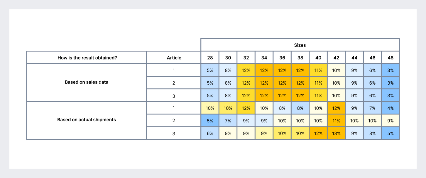 An unusual large one-time order can be an outlier. For example, if a product is aimed at children, but someone bought it for adults. The table shows an example of how such order can affect demand forecasting. The first three rows of the table are the demand distribution by size, as it should be in case of the correct product positioning. The bottom three rows are calculated based on actual data containing outliers.