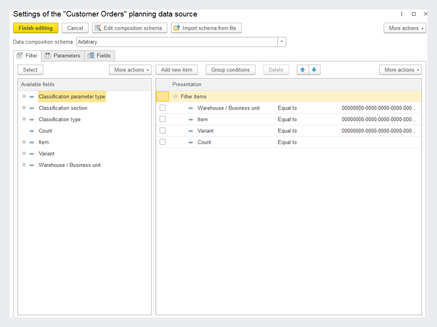 In 1C:ERP, you can filter out unnecessary data when calculating seasonal indexes and distribution standards. You can also set filters when creating a sales forecast: the forecast will be generated based on the necessary data only. For example, you can consider only category A products (in the ABC analysis).