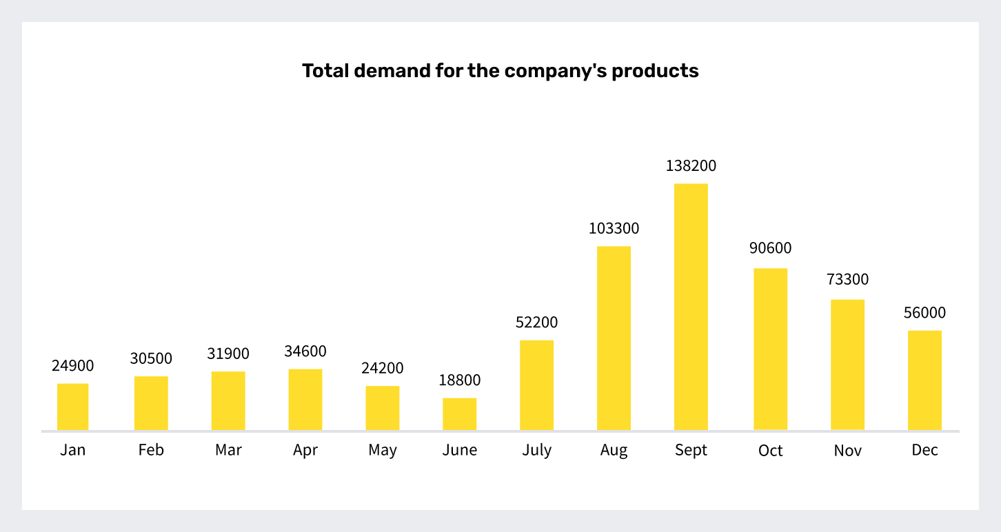 For example, in sportswear sales, you can often see the annual frequency of demand. Every year, consumer behavior fits into a pattern: average sales in the first quarter, low sales in the second quarter, very high sales in the third quarter, and high sales in the fourth quarter. This feature is connected with the specifics of the goods sold and the internal logic of demand. From July to September, the demand increases due to the beginning of a new sports season and a new academic year. In May and June, the demand decreases due to the typical consumer behavior in these months: the end of an academic year and a sports season, the beginning of summer holidays.