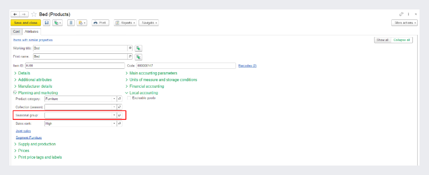 In 1C:ERP, you can specify which seasonal group an item belongs to
