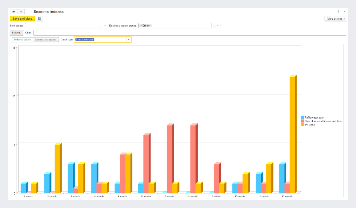 In the system, you can calculate seasonal indexes by business regions. For example, we know that clothes are sold slightly differently in Moscow compared to other regions of Russia. We know that demand in Moscow is more pronounced in the hot season months. And in general, we sell more in the central region. So, it makes sense to calculate seasonal indexes separately for Moscow and for other regions in order to get two independent sales forecasts.