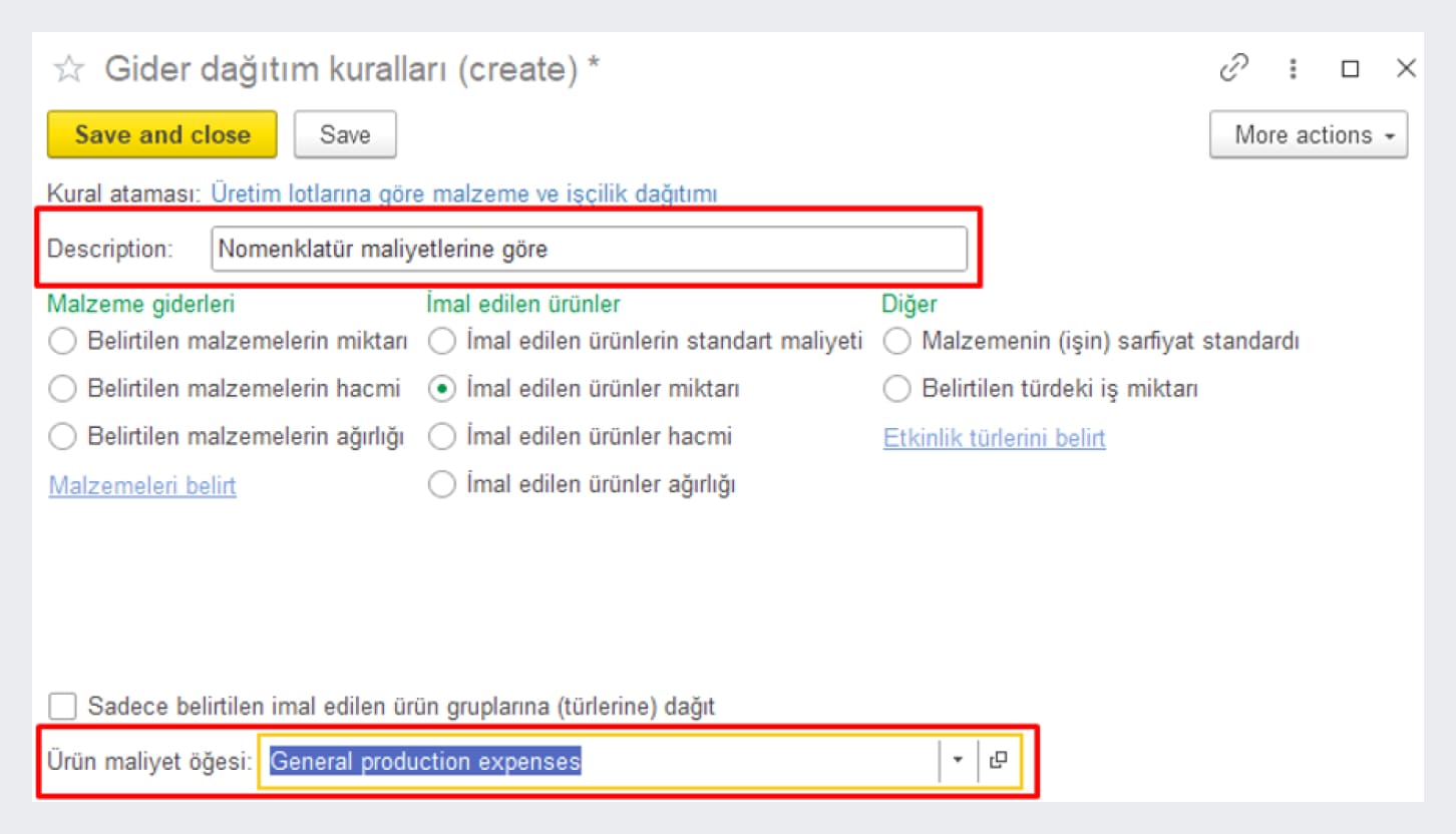 Gider tahsisi kuralı Üretim maliyeti (genel) olan bir gider kaleminin ve dağıtım kuralı belirlenmesinin ayarları