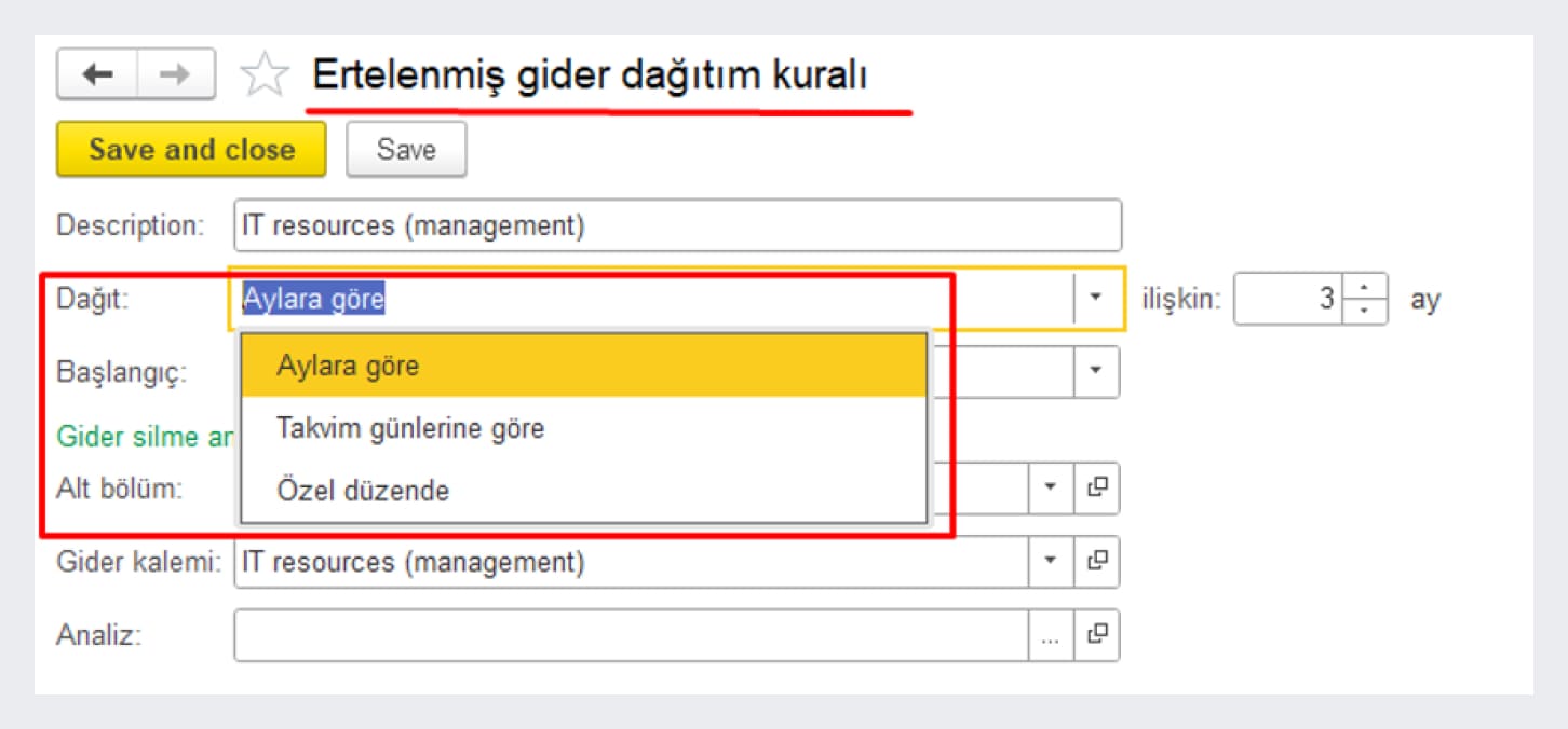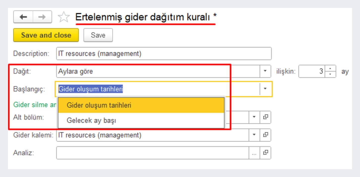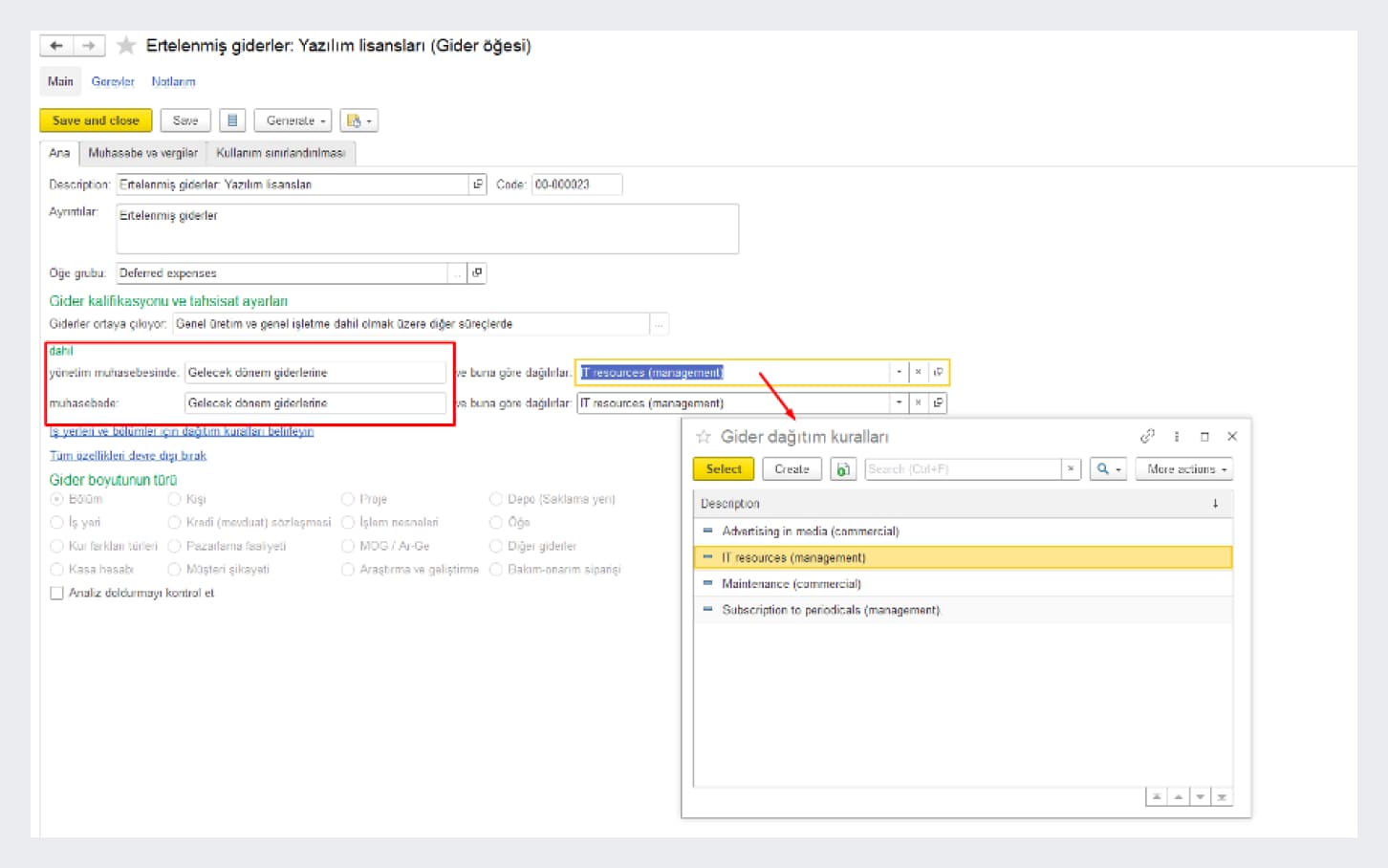 Gider tahsisi kuralı Ertelenmiş giderlere olan bir gider kaleminin ayarları