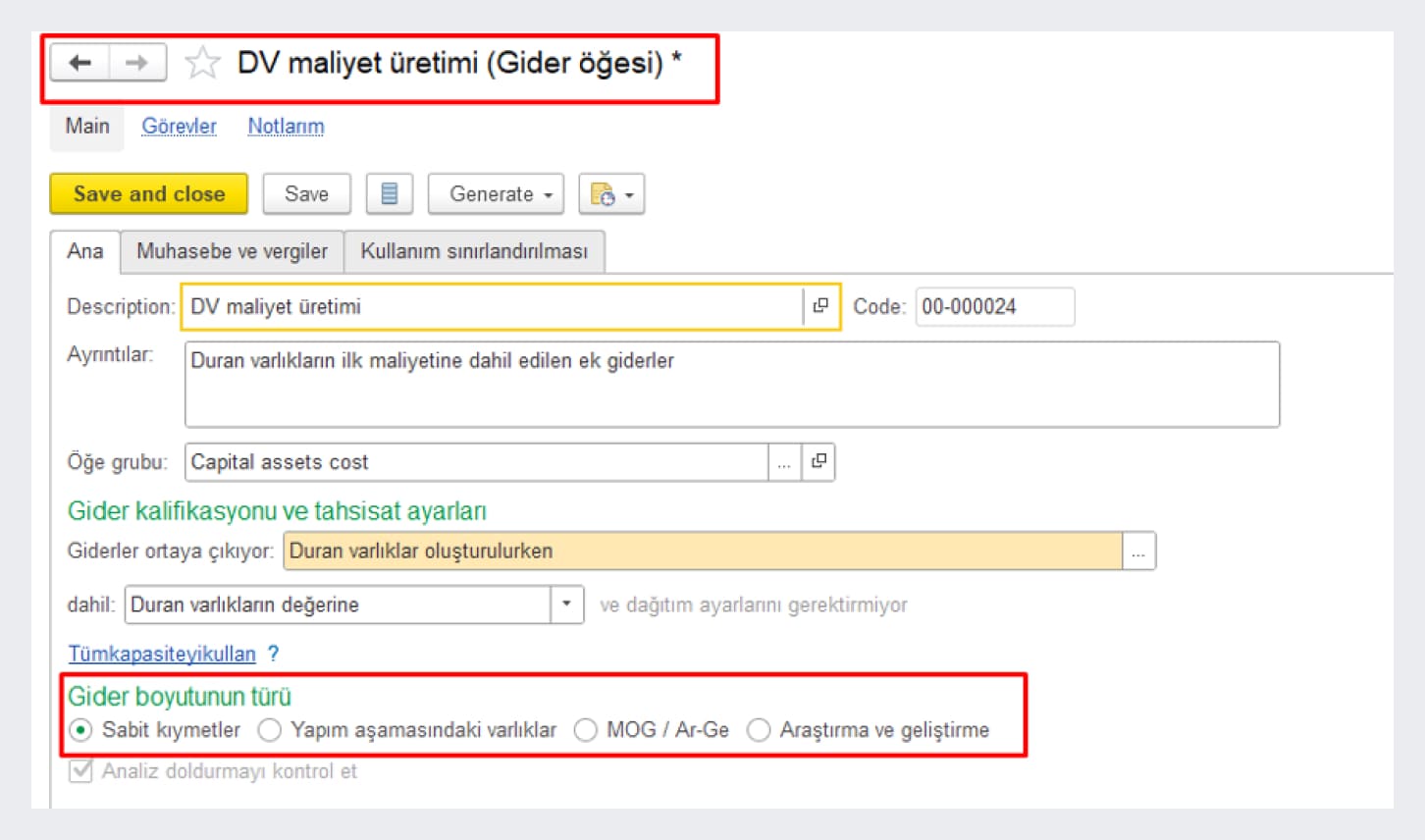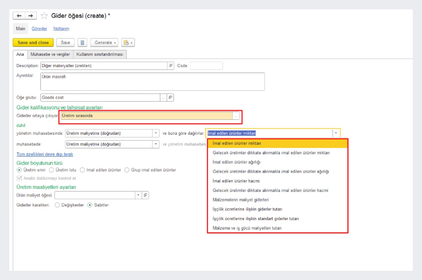 Giderleri üretim maliyetine dağıtmanın iki seçeneği vardır: "Üretim maliyeti (Direkt)" ve "Üretim maliyeti (genel)".