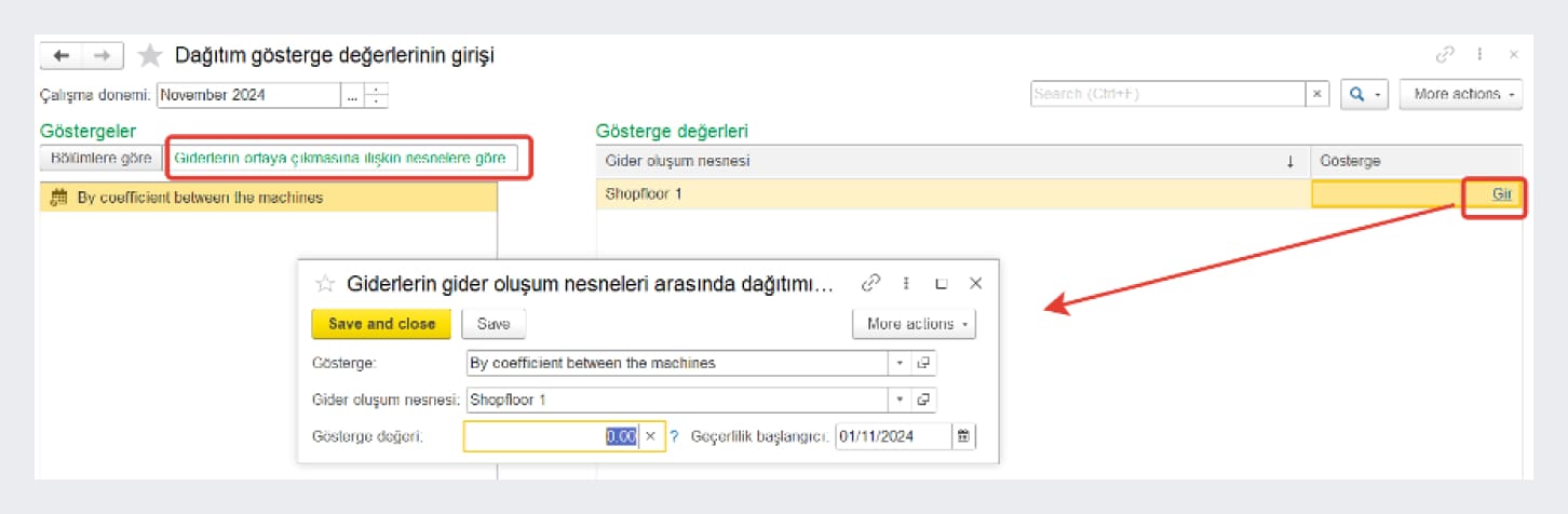 Gider dağıtım göstergelerinin maliyet merkezlerine göre girilmesi