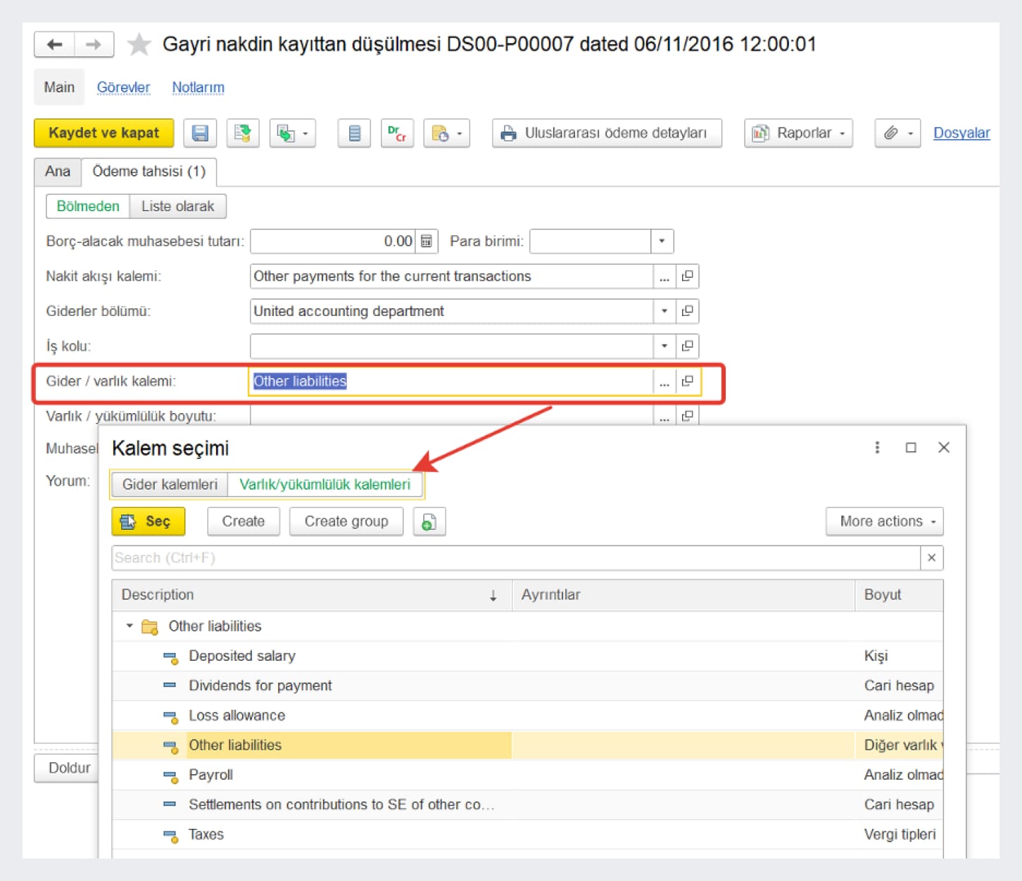 Diğer işlemleri kaydetmek için, varlık/yükümlülük kalemlerinin belirtildiği standart belgeleri kullanın.