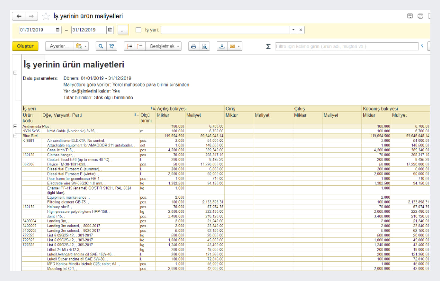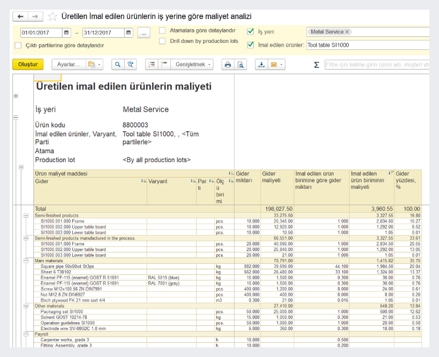 Üretim maliyetlerini analiz etmek için özel tasarlanmış raporlar kullanın, örneğin, "İş yeri stok maliyeti" ve "Ürün çıktı maliyeti".