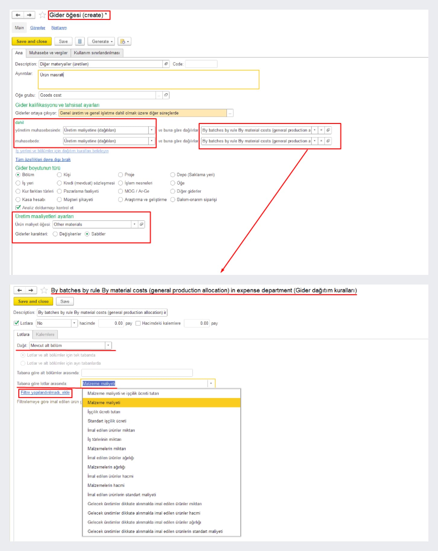 Giderlerin üretim maliyetine (direkt) tahsisi ayarları