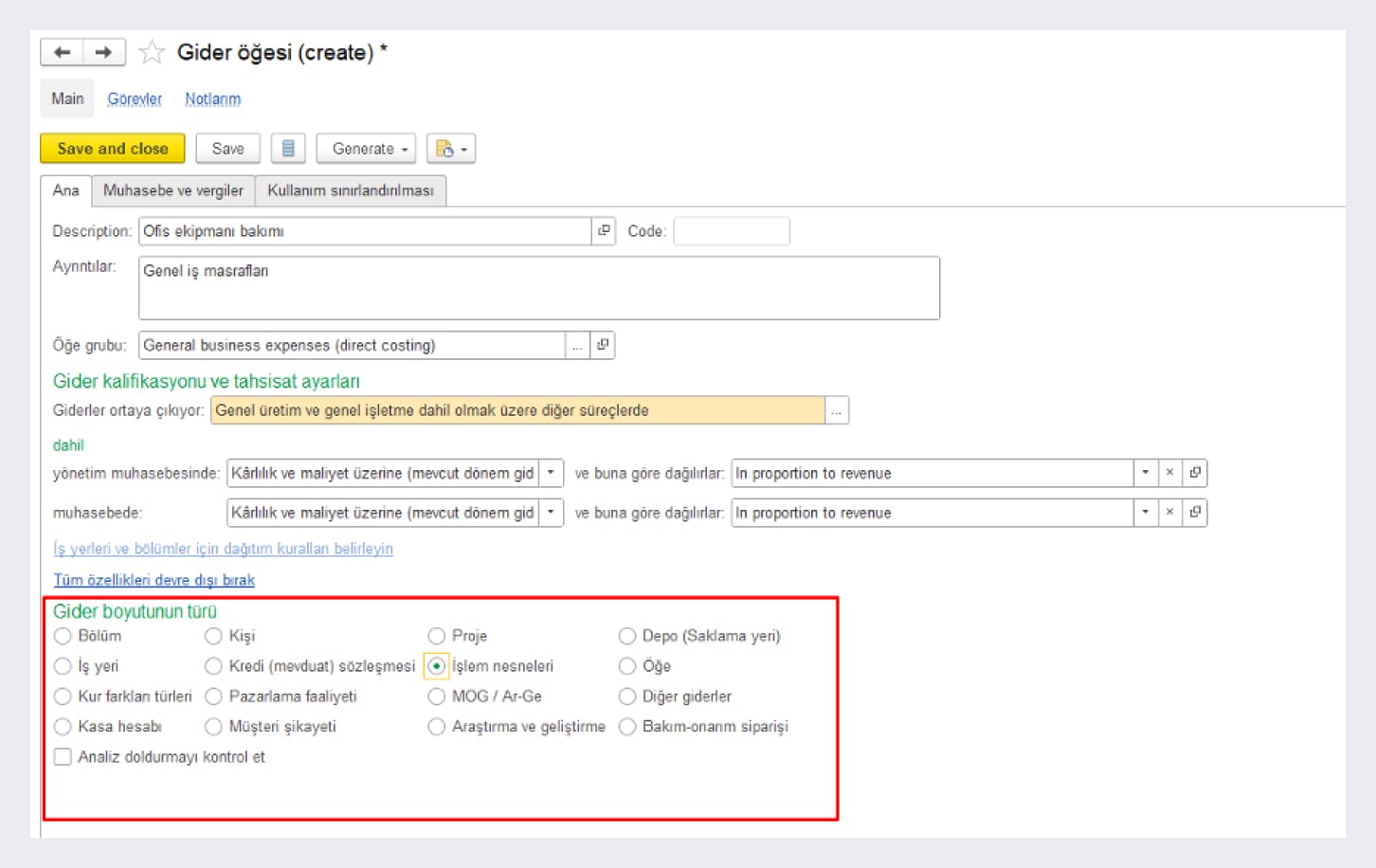 Ayrıntılı giderlerin muhasebeleştirilmesini maliyet merkezleri kullanarak düzenlemek için "Gider kalemleri" liste kartında "Maliyet merkezlerinde" gider nitelendirme seçeneği ve "Maliyet merkezlerine" dağıtım seçeneği yer alır.