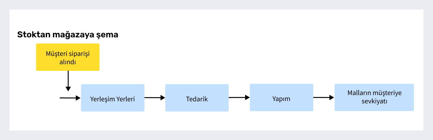 Stoğa üretim, talebi önceden (müşteri siparişleri gelmeden önce) tahmin etmeniz, üretim için malzeme temin etmeniz, gerekli her şeyi üretmeniz ve ürünleri ambara kaldırmanız gerektiği anlamına gelmektedir. Sonra müşteri gelir, ürünleri sipariş eder ve eğer istenilen ürünler stokta mevcut ise bunları müşteriye göndeririz. Eğer yoksa, göndermiyoruz.