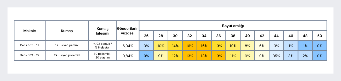 Ürün bedenine göre dağılım standartları şu tabloda gösterilmektedir: