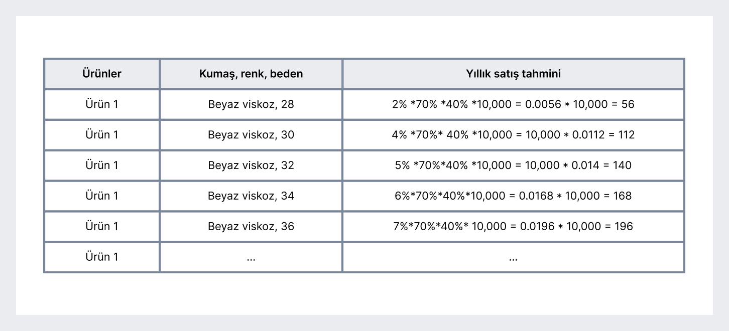 Üç dağılım standardı baz alınarak, standartları birbirleri ile çarparak toplam satışları kategorilere göre ayrıştırabiliriz. Örneğin, 10.000 / 5 * 0,6 * 0,3 * 0,1 = 36 adet XS beden siyah pamuklu "Ürün 1" ürününden satmayı planlıyor olalım.