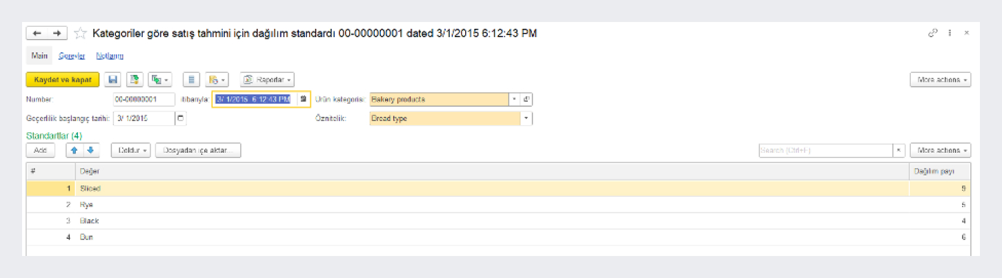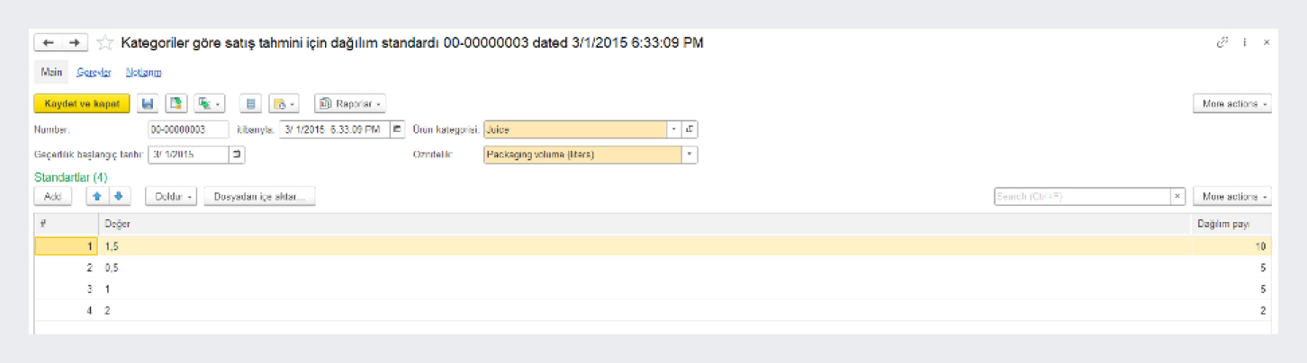 1C:ERP sisteminde dağılım standartları aracılığıyla satış tahminleri de aynı şekilde hesaplanmaktadır.