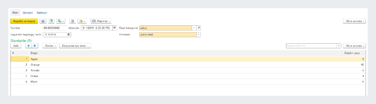 1C:ERP sistemindeki dağılım standardı, ilgili kategorinin toplam satış rakamının belirli ürünlere bölündüğü kural/pay/yüzdedir.