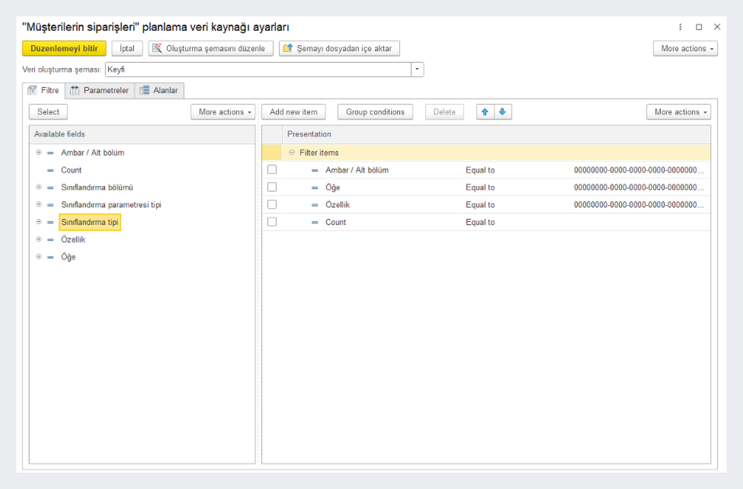 1C:ERP'de mevsimsel katsayıların hesaplanma ve/veya dağılım standartlarının hesaplanma aşamasında gereksiz verileri filtreleyebilirsiniz. Buna ilaveten, bir satış planı oluştururken filtreleri de belirleyebilirsiniz. Bu durumda plan oluşturulurken sadece belirli, "gerekli" veriler dikkate alınır. Örneğin, (ABC analizi yapılırsa) sadece A kategorisindeki ürünleri ele alabilirsiniz.