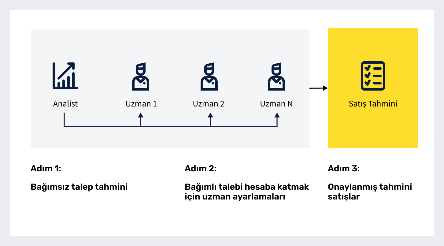 Farklı uzmanlardan gelen tahminler derlenir, hangi tahminlerin dikkate alınacağına karar verilir ve satış tahmini onaylanır.