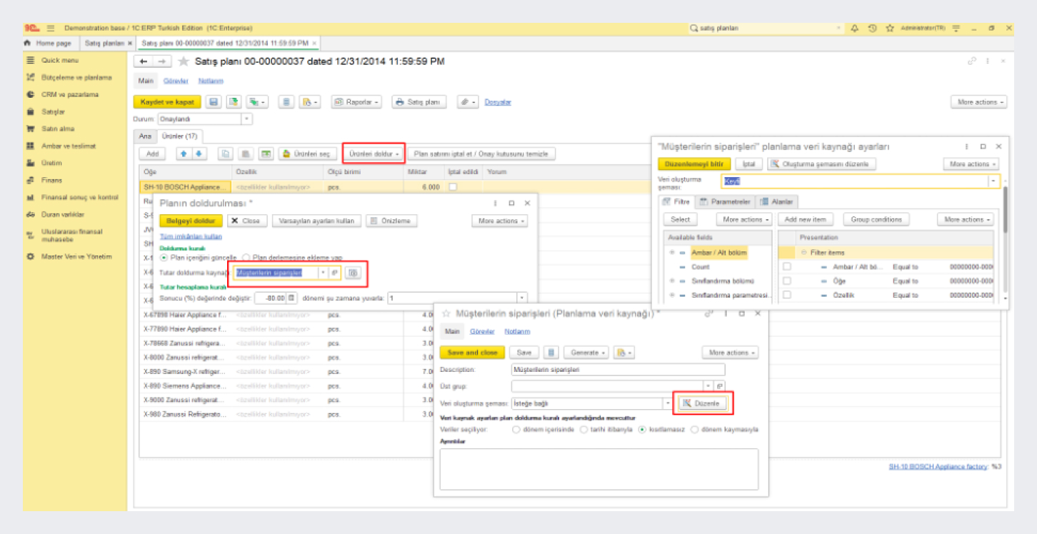 1C:ERP sisteminde önceki dönemlerin verileri baz alınarak, satış tahminlerini hesaplama imkanı ve planların verilerini manuel olarak ayarlamak mümkündür. Bu sayede hem bağımlı, hem de bağımsız talep hesaba katılabilir.