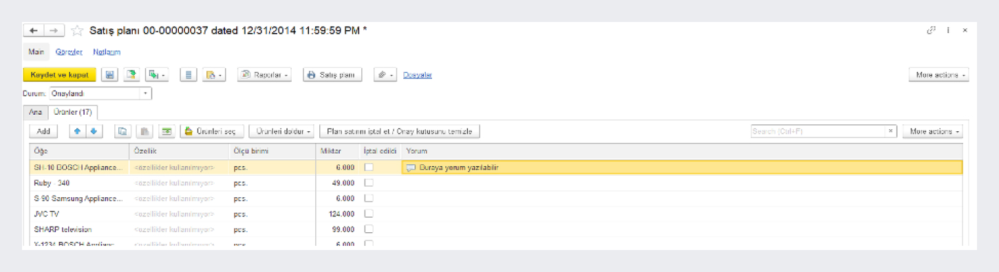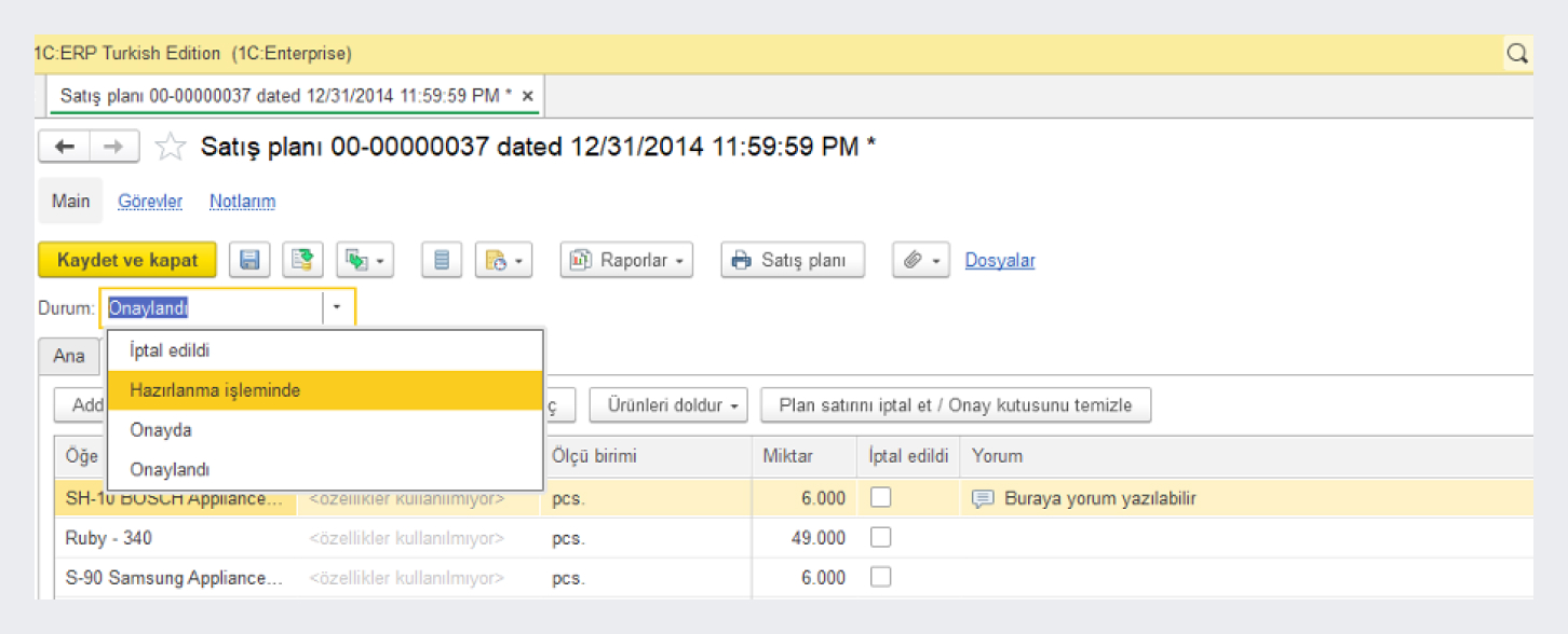 1C:ERP'de planın her satırına yorum girilebilir (her bir ürün için)