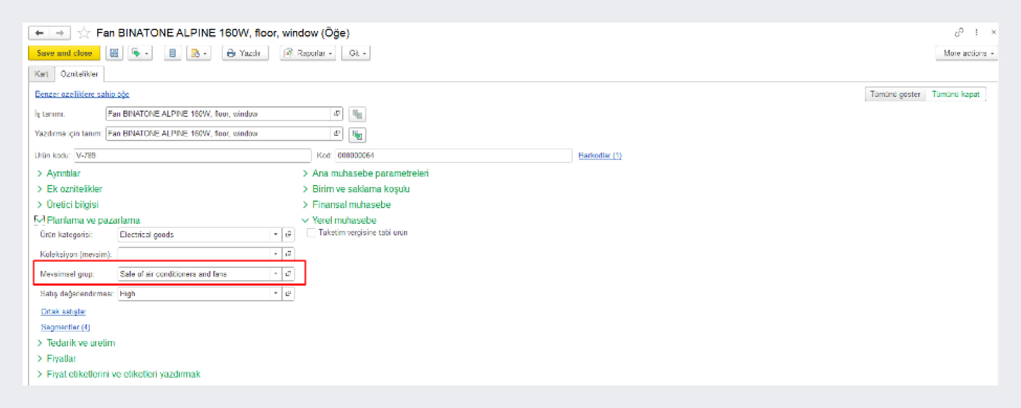 1C:ERP'de ürünlerin hangi mevsimsel gruba ait olduğu belirlenebilir