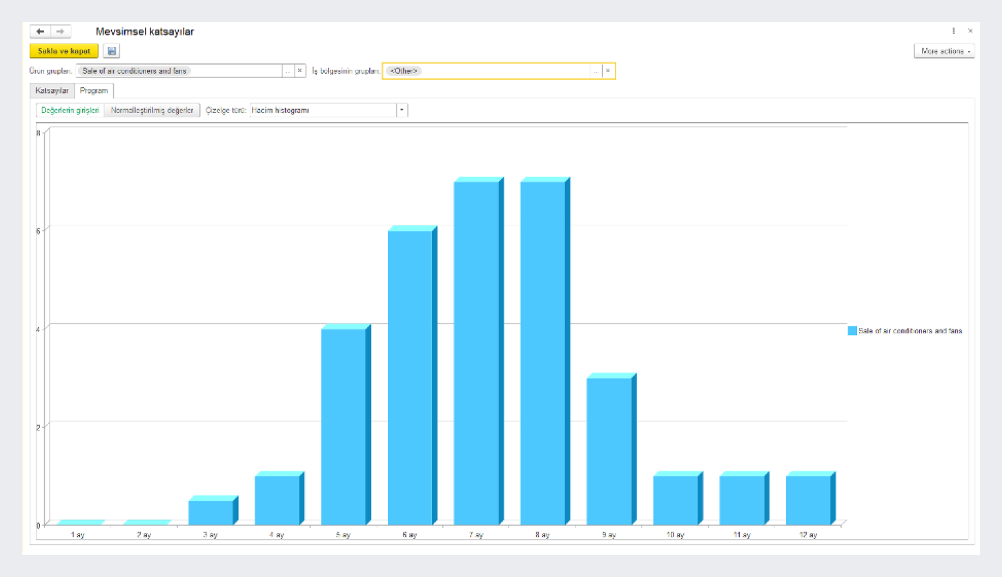1C:ERP'deki mevsimsel katsayılar, veri tabanında saklanan satış istatistiklerine göre otomatik olarak hesaplanabilir.